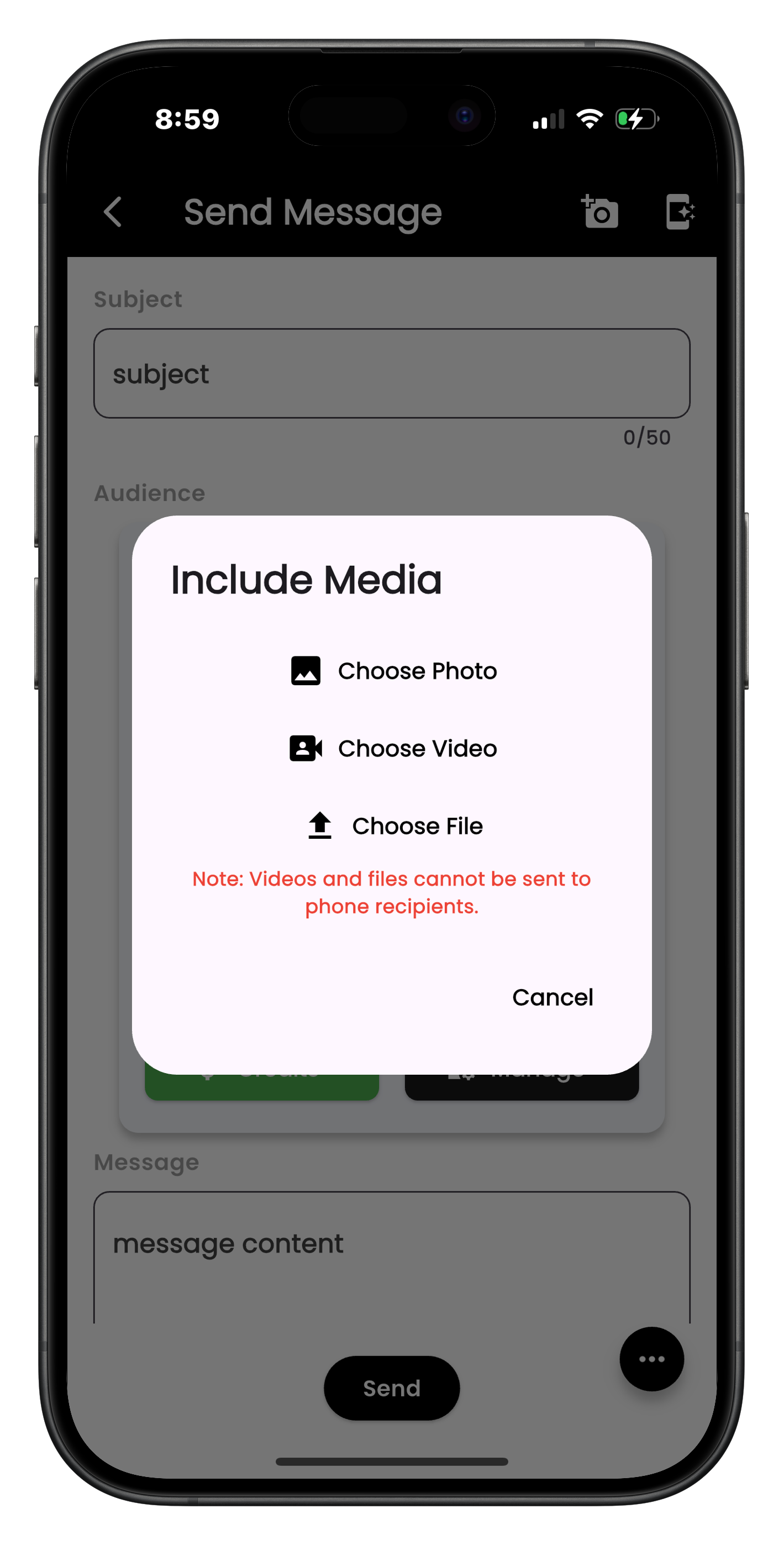 Subject-based messaging with attachments (images, videos, PDFs).