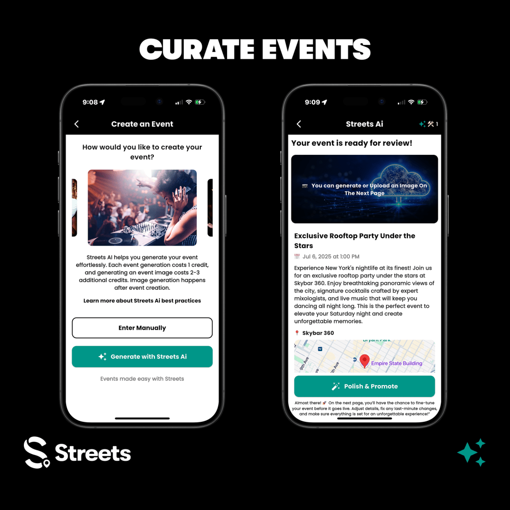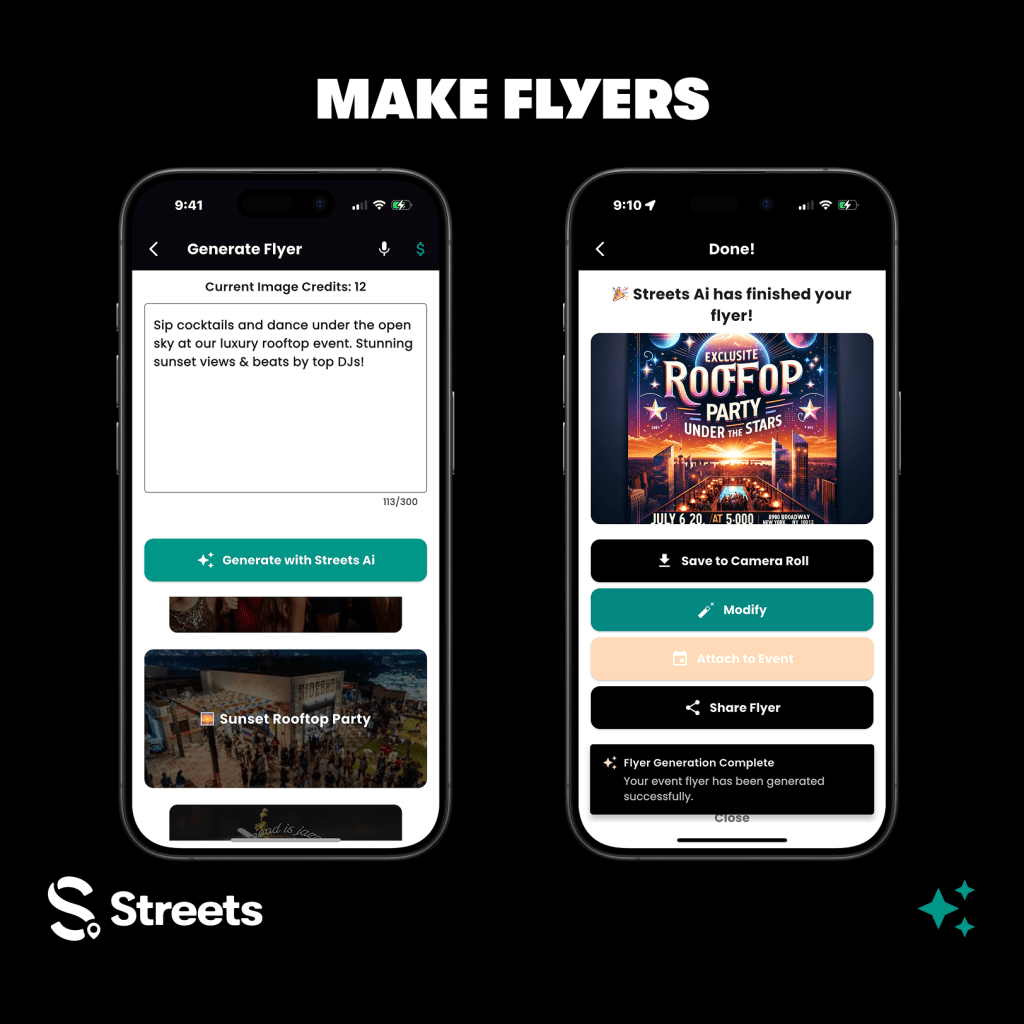 ✔️ Smart event search – Users can speak or type queries to instantly find events, curators, and vendors. ✔️ AI-generated event inspiration – Users can describe an event, and Streets AI will assist in setting up time, location, and details. ✔️ AI-powered flyer creation – Users can design high-quality AI-generated flyers based on their event descriptions. (Currently available on iOS, coming soon to Android!) ✔️ Streets Image Editor – Modify and enhance existing event visuals.