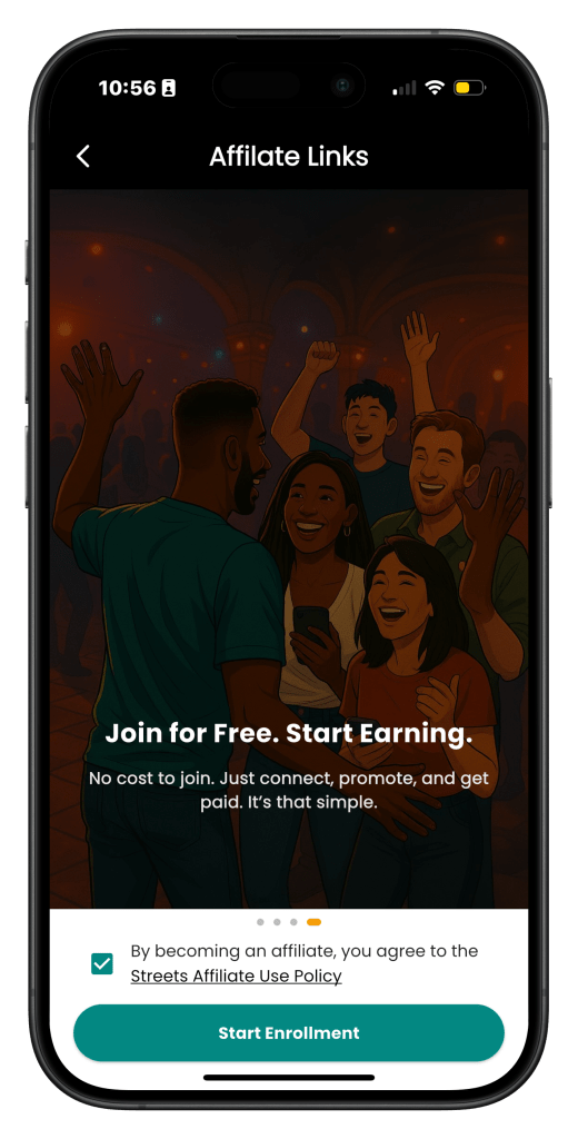 Whether you’re an artist, influencer, or just someone with reach, any Streets user can become an affiliate. All you need to do is complete a quick identity verification through Stripe to securely receive payouts.