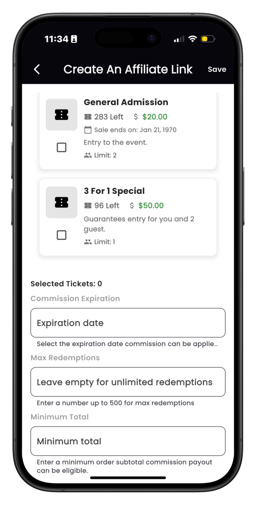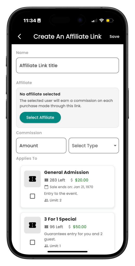 Affiliate Links let curators and vendors invite others to help promote their events or offerings. It’s perfect for trusted crew members, influencers, or anyone ready to help you grow; and it works for both events and product orders.